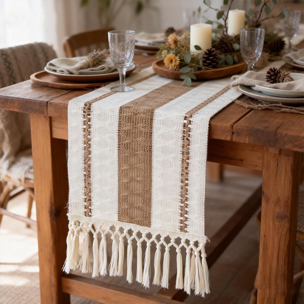 - 【Rustic Farmhouse Charm】 Elevate your dining room decor with this natural beige and cream striped table runner. Its woven texture and delicate tassels deliver a cozy, boho home decor vibe perfect for farmhouse or country style settings.